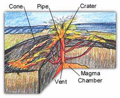 a cone-shaped hill of volcanic material surrounding an opening in the earth