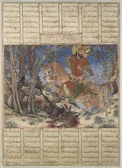 Bahram Gur fights the Karg, Islam, 14th century, Paper, Ink, Gold.