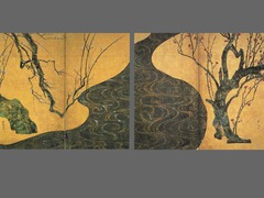 White and Red Plum Blossoms, Japanese,18th century, Ink, Watercolor, and Gold, and Paper, Korin