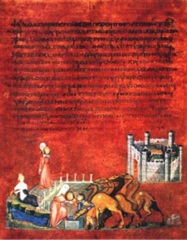Rebecca and Eliezer at the Well and Jacob wrestling the Angel, from the Vienna Genesis, Byzantine, 6th century, Vellum