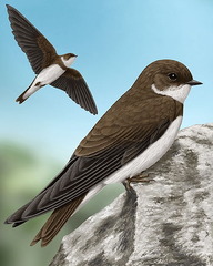 Small swallow with brown upperparts, and a brown breast band seperating white underparts from white throat and chin. Tail is notched.