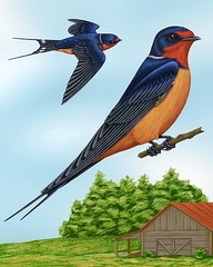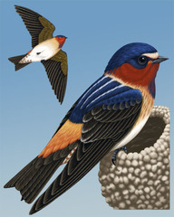 Medium swallow with glittering blue-black upperparts, red-brown forehead, chin and throat.