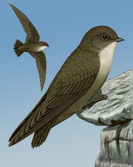 Small, stocky swallow, brown upperparts, paler underparts, pale brown throat.