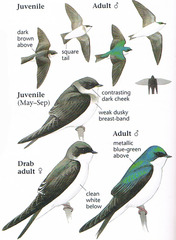 Large, vocal swallow with glossy dark purple-blue body and forked tail. It is the largest North American swallow. Black bill, legs and feet. Stong, graceful flight, alternates a few rapid wing beats with long glides. Catches and eats insects in flight and also forages on the ground.