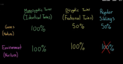 monozygotic: one egg, one sperm; dizygotic: two eggs, two sperm