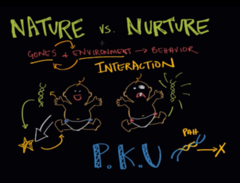 mutations to a gene that codes for a liver enzyme. Phenylalanine doesn't get converted, so too much phenylalanine can cause brain problems. If you do the right diet, it is OKAY. Interaction between genes and environment.