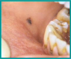 Milky white lesions of buccal mucosa that disappear when stretched; more prominent in dark skin individuals
