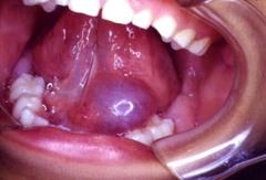 Fluid filled nodule on the floor of the mouth, usually associated with sublingual gland. Known as the "mucocele of the floor of the mouth"