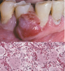 Multinucleated giant cells, very vascular causing deep reddish color- clinical appearance similar to pyogenic granuloma