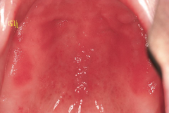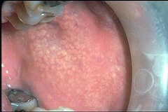 A hyperkerototic wrinkled appearance to the hard palate with scattered red dots due to inflamed minor salivary glands