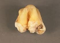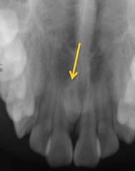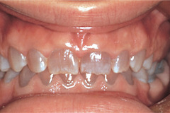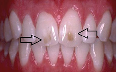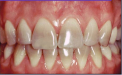 Staining that may occur from enlarged pulp chamber or trauma (darkened dentin)
