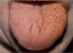 Fissures and grooves on the dorsal surface of the tongue, common in down syndrome patients