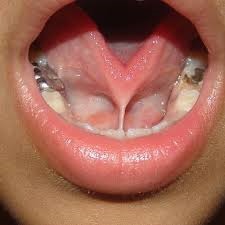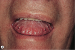 Reddened atrophic area at midline of the tongue on the dorsal surface, often associated with candida albicans