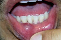 Bluish pink fluid filled nodule on lower lip caused by severance of the salivary gland