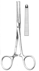 A small, straight or curved hemostatic forceps used to hold delicate tissue or compress a bleeding vessel.