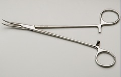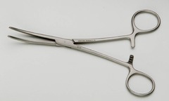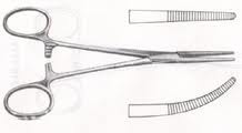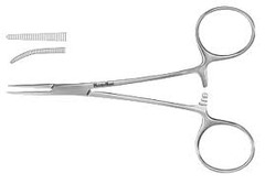May have an open finger ring; curved, locking clamp used to control bleeding and ligation and used for passing suture
