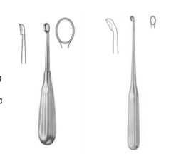 Spoon-shaped tip; sharp cutting edge; multiple sizes used to remove bone and tissue by scraping and scooping; ring curettes are also available