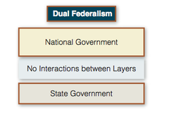 A system of government in which power is divided between one central government and several regional governments (dual or cooperative). Used in USA and a few other countries. Most countries have unitary governments.