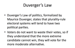 Law of politics, formalized by Maurice Duverger, stating that plurality-rule electoral systems will tend to have two political parties