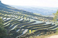 Ancient farming technique for growing crops on hillsides or mountain slopes, using step-like horizontal fields cut into the slopes