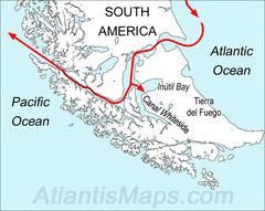 A navigable sea route separating mainland South America to the north and Tierra del Fuego to the south. Named after Ferdinand Magellan, a navigator who sailed around the world during the Age of Exploration.