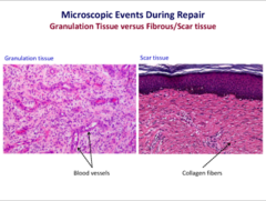 Proliferative: (day 3-weeks) fibroblasts, myofibroblasts, endothelial cells, macs; granulation tissue and type III collagen, angiogenesis, wound contraction. vitamin c