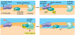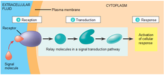 reception - receptor responds to binding of ligand molecule; transduction - translation and amplification of message; response - activation of cellular response