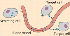 Circulating chemical signals that are formed in specialized cells, travel in body fluids, and act on specific target cells.