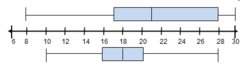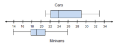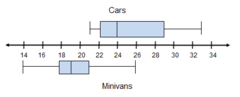 The box plots show the average gas mileage, in miles per gallon, of cars and minivans tested by a certain company.