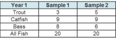 About twice as many trout were in the pond at the time the second sample was taken.Fewer bass were in the pond at the time the second sample was taken.