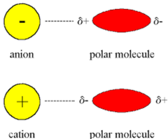 Attractive force between an ion and the oppositely charged end of a polar molecule