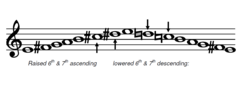 a minor scale that is altered so that the sixth and seventh note of the scales are altered by a half step in ascending motion and lowered to natural minor in descending motion.
