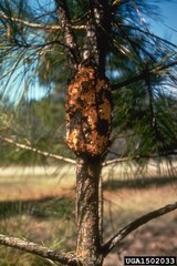 Symptoms to Host - Big yellow puss balls, branch dieback, split bark