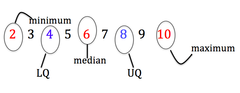 The five numbers that make up a box-and-whisker plot (least value, first quartile, median, third quartile, and greatest value)