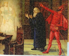 Before the start of the play, he became the ruler of Denmark by pouring poison into the ear of his sleeping brother, King Hamlet. He then married Gertrude, King Hamlet's widow. In the play's first act, Prince Hamlet learns of his uncle's treachery by speaking to King Hamlet's ghost. Hamlet then arranges for a troupe of actors to perform a play titled The Murder of Gonzago, which Hamlet revises to increase the similarities to his father's death. He is disturbed by the performance, and storms out during the murder scene. Later, he prays for forgiveness, causing Hamlet to delay killing him out of fear that his soul would go to heaven. As Hamlet feigns madness, he sends him to England with Rosencrantz and Guildenstern, who unknowingly carry a letter calling for Hamlet's execution. After Hamlet escapes and returns to Denmark, he arranges for Hamlet to fight a duel with Laertes, who seeks revenge for the death of his father, Polonius, and sister, Ophelia. Laertes uses a poison-tipped sword, and he prepares a poisoned drink as a back-up. When Laertes falls in combat he reveals the plot, prompting Hamlet to stab him with the poisoned sword, and make him drink from the poisoned cup.