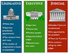Constitutional division of powers among the legislative, executive, and judicial branches, with the legislative branch making law, the executive applying and enforcing the law, and the judiciary interpreting the law