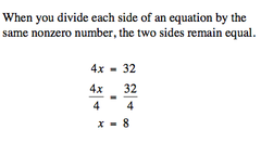 If you divide each side of an equation by the same nonzero number, the two sides remain equal. if a = b and c is not equal to 0, then a/c = b/c