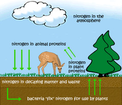 In atmosphere, amino acids, and organic materials. Organisms intake nitrogen through nitrogen fixation. The nitrates in the soil are used in plant DNA, heterotrophs eat them and then return them to the soil when they die.