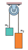 A 200.0-gram mass (m2) and 50.0-gram mass (m1) are connected by a string. The string is stretched over a pulley. Determine the acceleration of the masses.