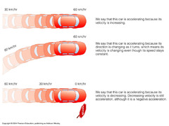 The change in an objects speed and/or direction; speeding up slowing down, or change in direction.