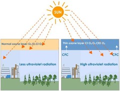 More harmful UV rays hit earth due to a gradual decrease of the layer of ozone (upper atmosphere); caused by products using chlorofluorcarbons or cfc's.