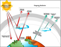 The atmosphere traps solar radiation, because of gases such as CO2, methane and water vapor.