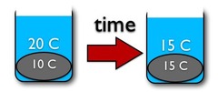 Energy that is transferred between objects. Heat may be "lost" - as when an object at a high temperature transfers its energy to its surroundings, and cools down - or it may be "gained" - as when an object at a low temperature absorbs energy from hotter objects around it, and warms up.
