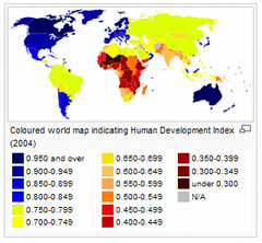 Levels of the quality of life in a given country. MDC, LDC, NIC. (More developed country, less developed country, newly industrialized country.)