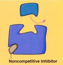 Inhibitor binds to another part of the enzyme (allosteric site) altering its conformation (shape); ex. heavy metal poisoning (heavy metals bind to allosteric sites on enzymes)