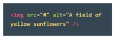Another attribute for <img> elements, which also lives inside the image element. Value is a description of the image in case it is unable to be viewed. (<img src=image link alt="insert description"/>)