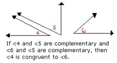 angles supplementary to the same angle or to congruent angles are congruent. Ex. If angle 1 + angle 2= 180, and angle 2 and angle 3=180 then angle 1 is congruent to angle 3