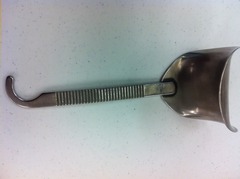 Retracting and Exposing. Hand held retractor, flat, large curved blade with hollow hand grip for traction. Heat-sharped viscera protector at the tip to prevent perforation. Alias: Sweetheart.