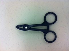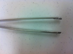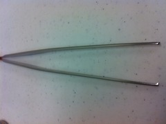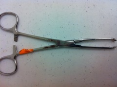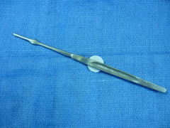 Dissecting. Placed between the jaws of a curved hemostat for blunt tissue dissection.