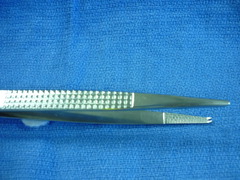 Suturing. Used for holding delicate to intermediate size needles when suturing Narrow rounded tip with crisscross gripping pattern in the inner jaws